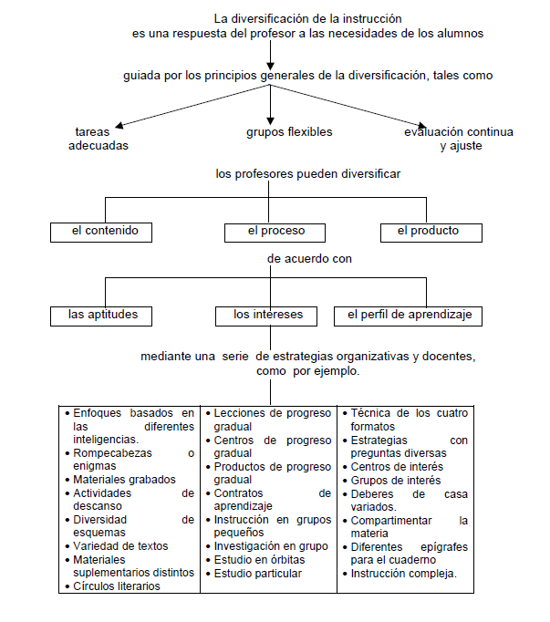 En relación con los tres momentos donde tiene lugar la diversificación en el aula. Tomlinson propone modificaciones al contenido, al proceso y al producto. Según Tomlinson, “el contenido es aquello que quiere que sus alumnos aprendan y los materiales o mecanismos que va a utilizar para tal efecto. El proceso hace referencia a las actividades diseñadas para hacer que los estudiantes usen las habilidades básicas dando sentido a las ideas esenciales. Los productos son los vehículos a través de los cuales los chicos demuestran y amplían lo que han aprendido” (2001, p. 106). La modificación a estos criterios corresponde a la habilidad del profesor para identificar contenidos esenciales que contribuyan a la comprensión de ideas centrales, en especial, para estudiantes que presentan ciertos retos al momento de inferir o extraer conclusiones en un área determinada de conocimiento. De igual forma, el docente es el encargado de diseñar una amplia variedad de actividades y estrategias asociadas a productos finales que garanticen el buen desempeño de los estudiantes con un impacto significativo en el ámbito cognitivo y emocional.